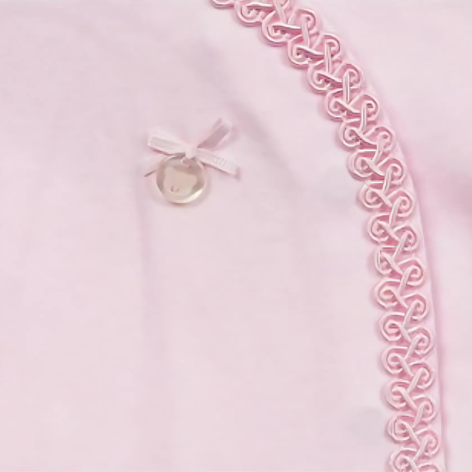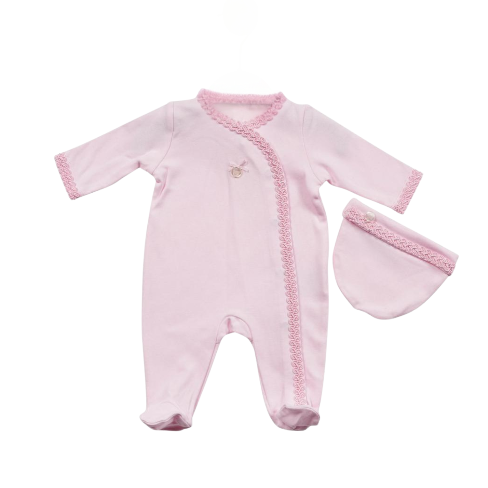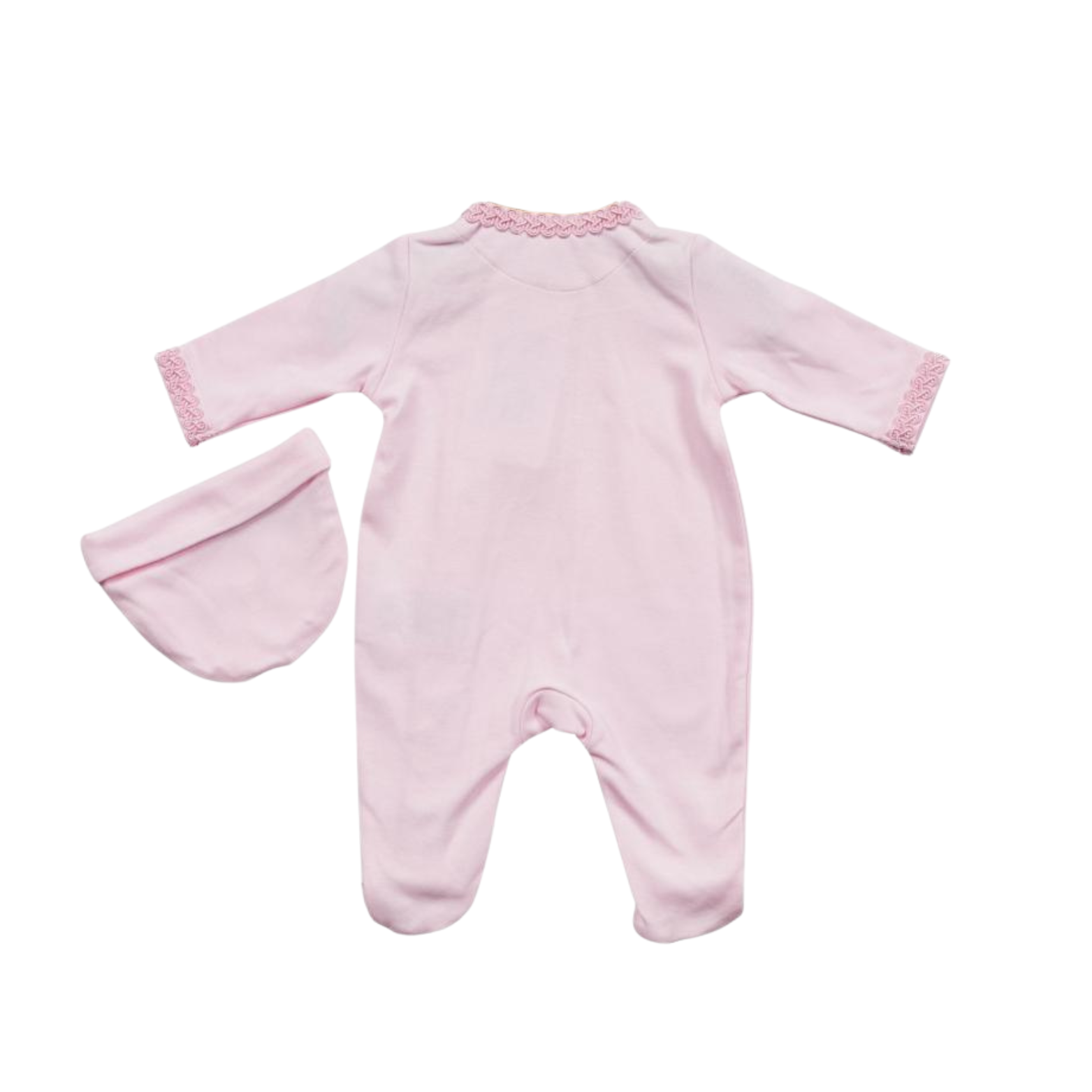 All in one with brocade and tag detail. Back and leg popper fastening. Hat to match.