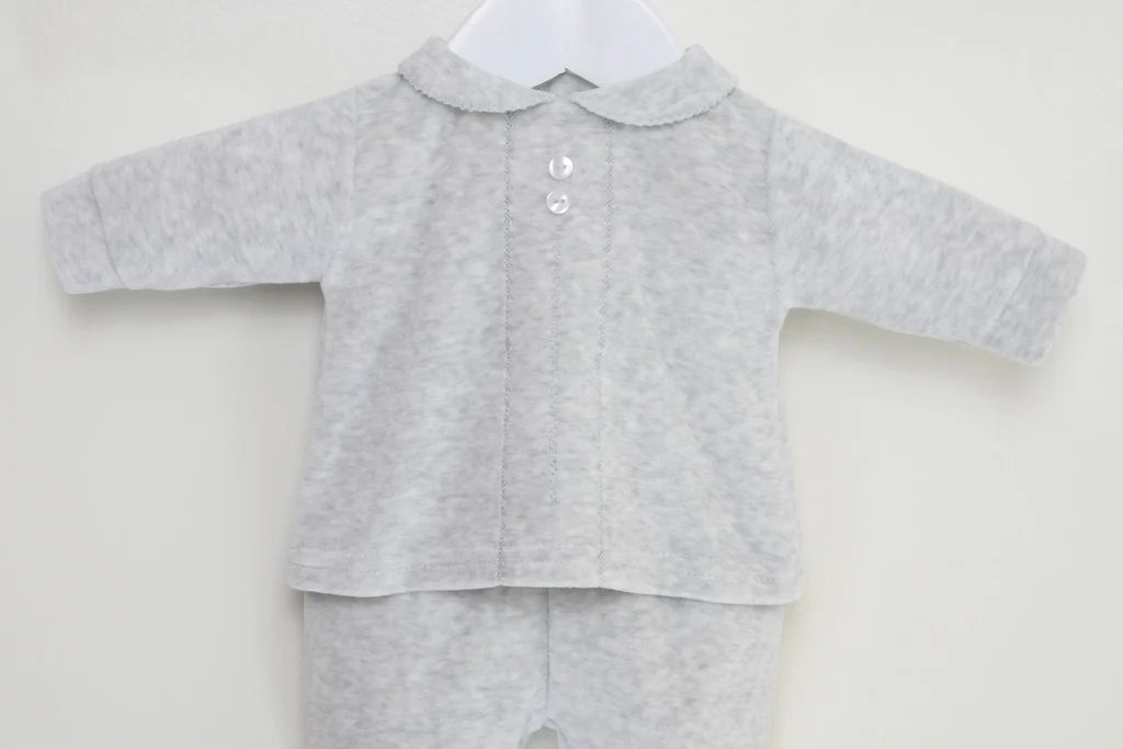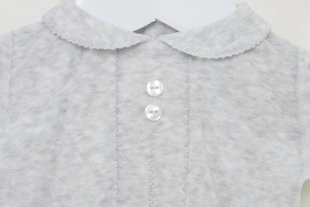 Made in the softest velour, this is a gorgeous way to lounge in style. The top has an elegant peter pan style collar and there are embroidered stitch details to the front with ornamental buttons at the neck. The matching trousers are comfortably elasticated at the waist and have cosily enclosed feet.