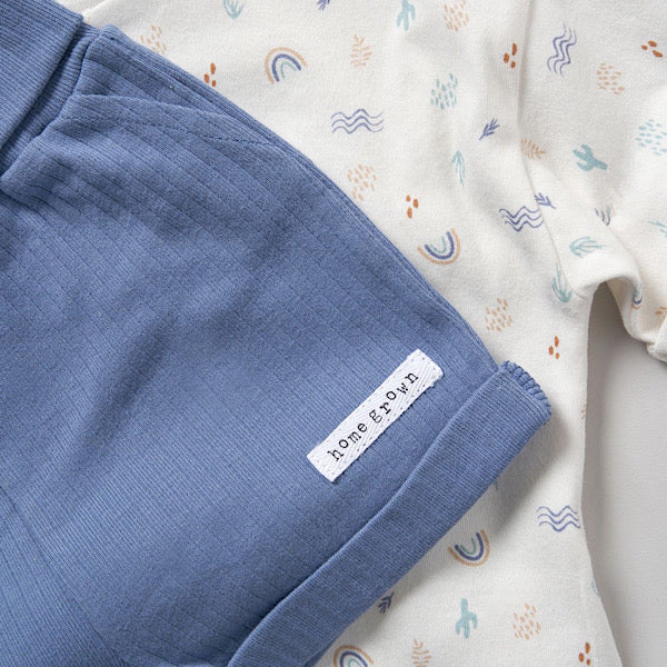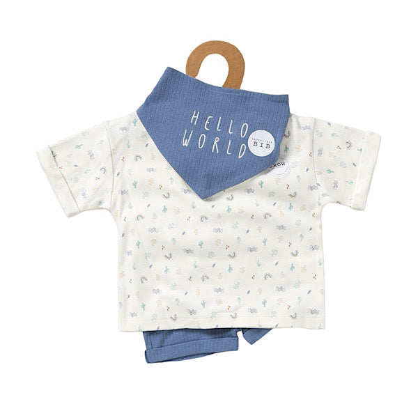 Baby Boys Organic "Hello World" Ribbed 3pc Set included with a ribbed top (poppers at the back for fastening the top), reversible "hello world" bib and co-ord with ribbed shorts.
