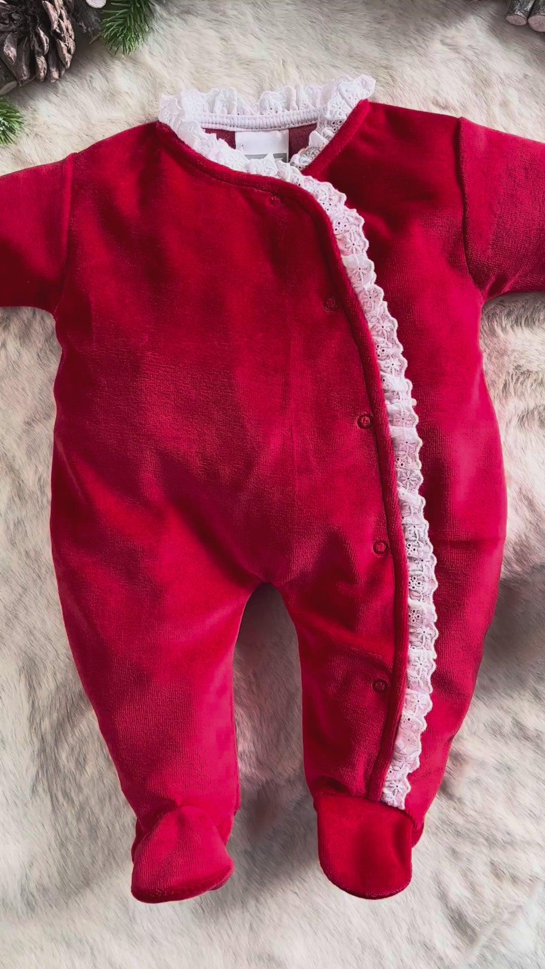 Made in beautifully soft pure white 80% cotton velour this sleepsuit is as comfortable as it is elegant. Trimmed with a dainty broderie lace around the neckline and down the front edge. Handy press studs run down the front edge.