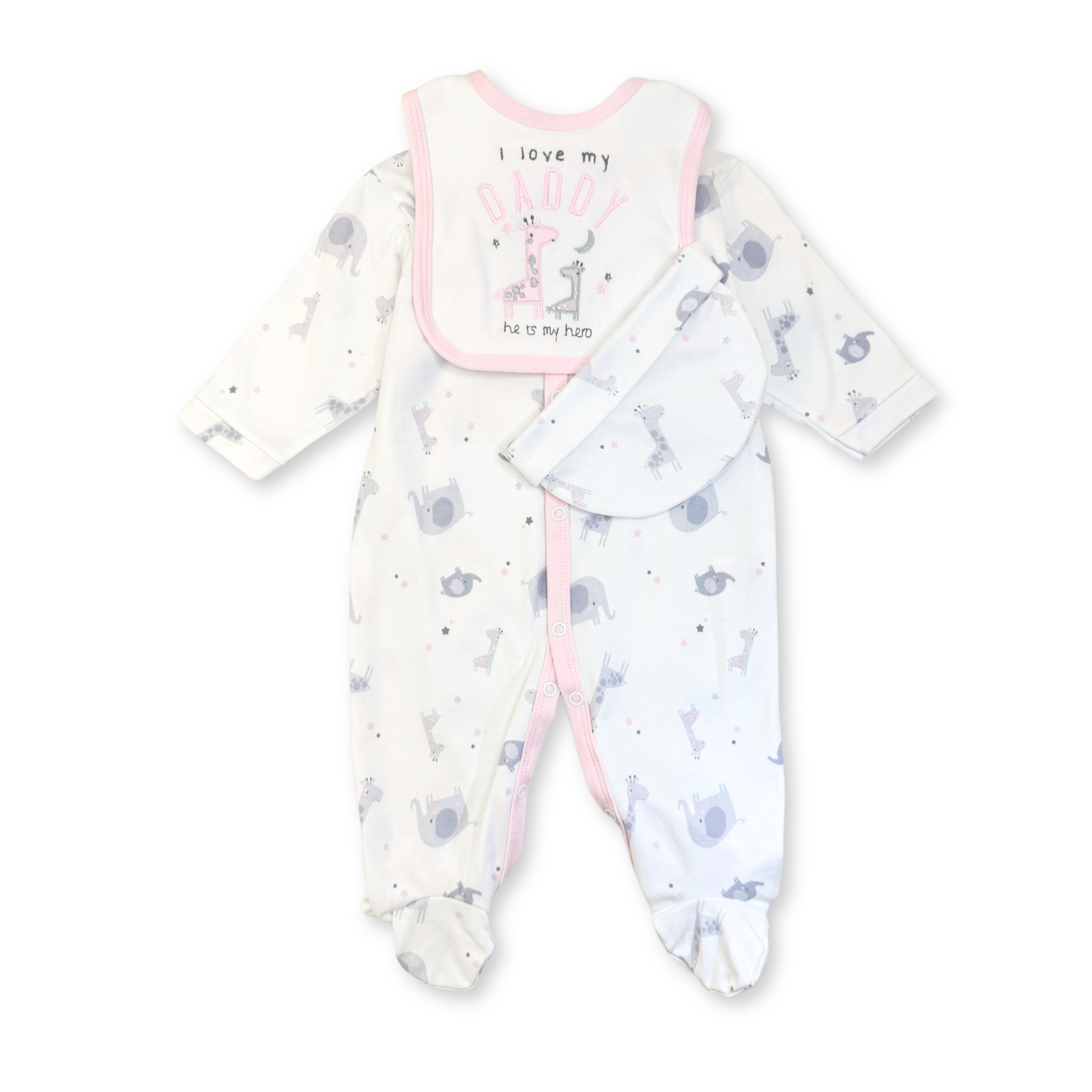 Baby ivory elephant & giraffe print three-piece layette set including press stud fastened sleepsuit, bib with rainbow 'I Love My Daddy He Is My Hero' quote motif print and beanie hat.