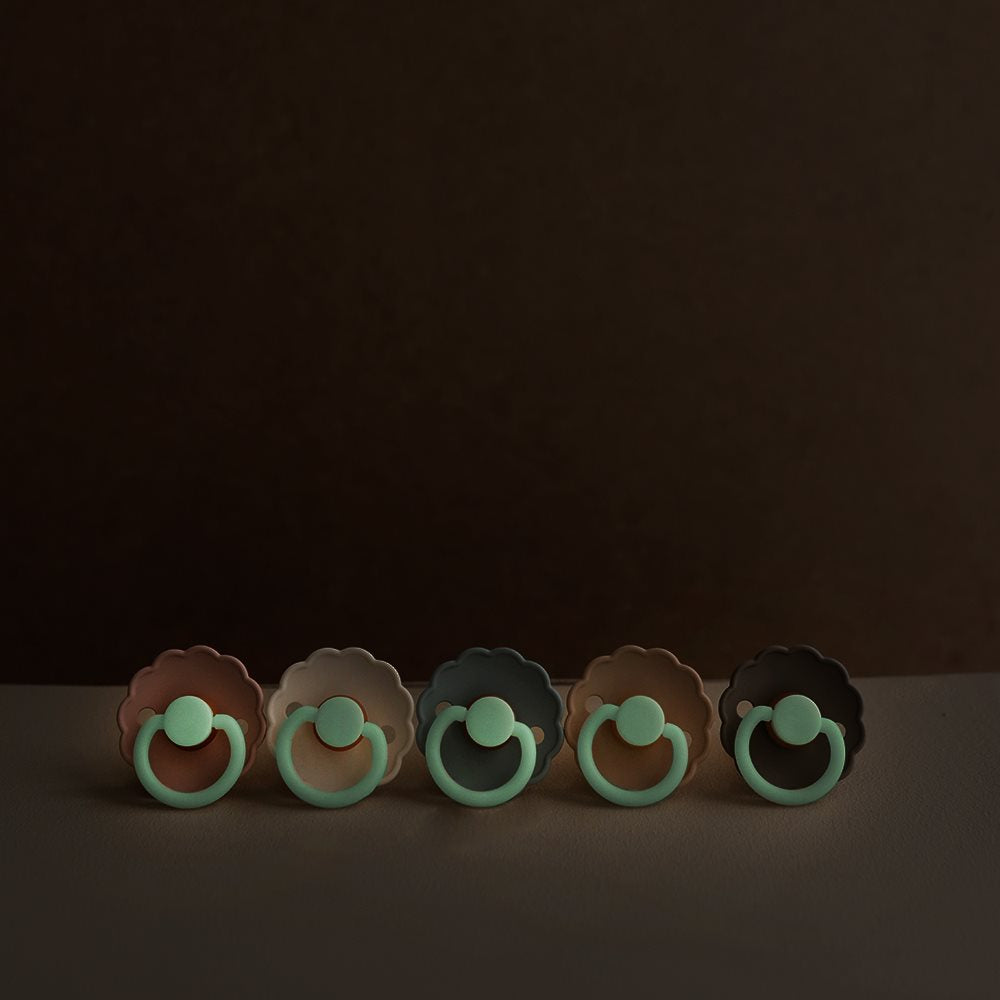 What's Included: 1 set of 2x FRIGG Daisy Night silicone pacifier.