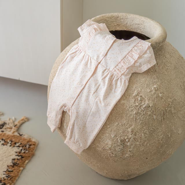 Soft and comfortable. This playsuit is made of soft cotton with stretch, wonderfully comfy for your little girl. The light pink suit with pretty golden dots has short sleeves and ruffles with embroidery over the shoulders. The playsuit has press-studs on the front and between the legs for easy dressing and undressing. The matching hairband with bow completes your little one's outfit.