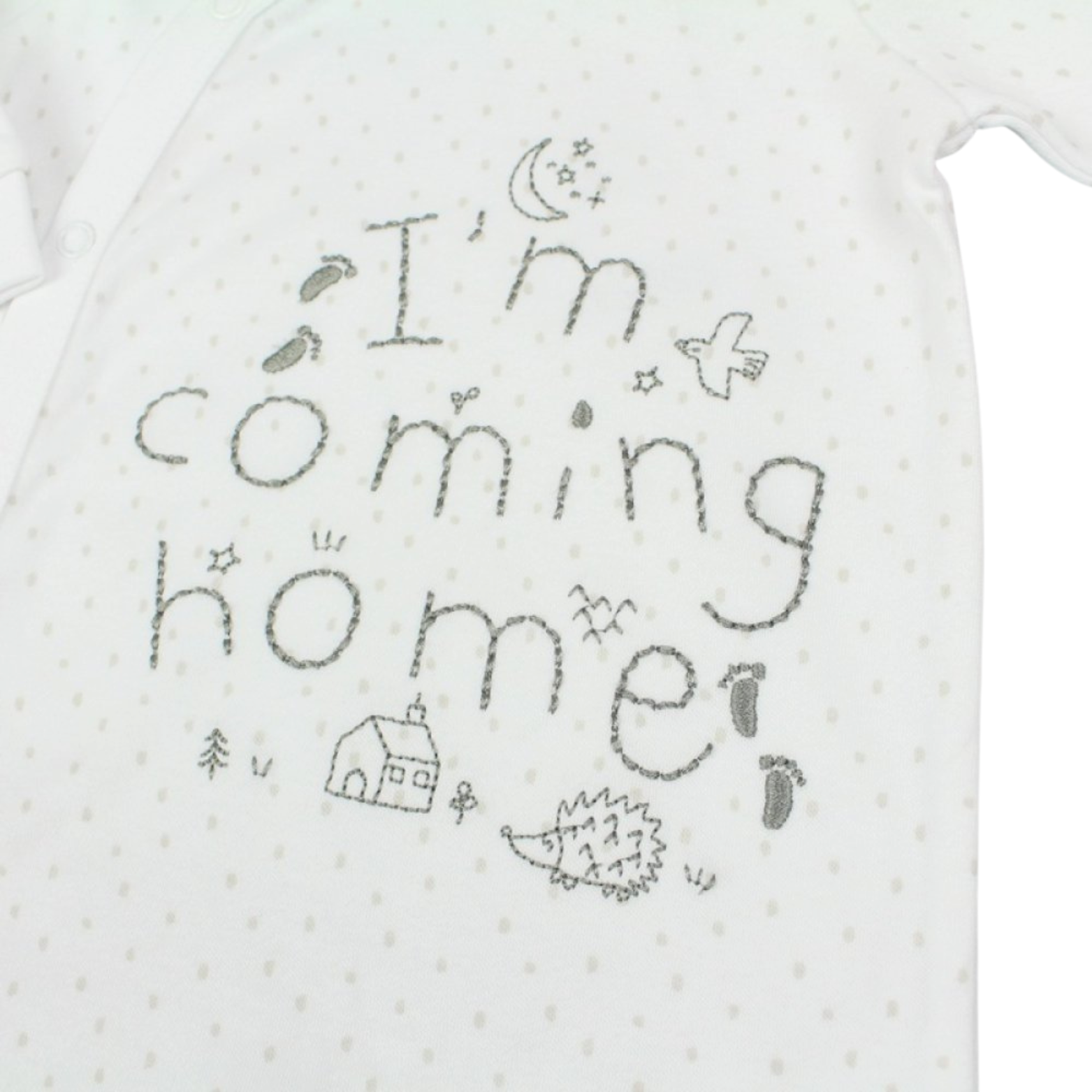 Embroidered "I'm Coming Home" sleepsuit with stars printing.