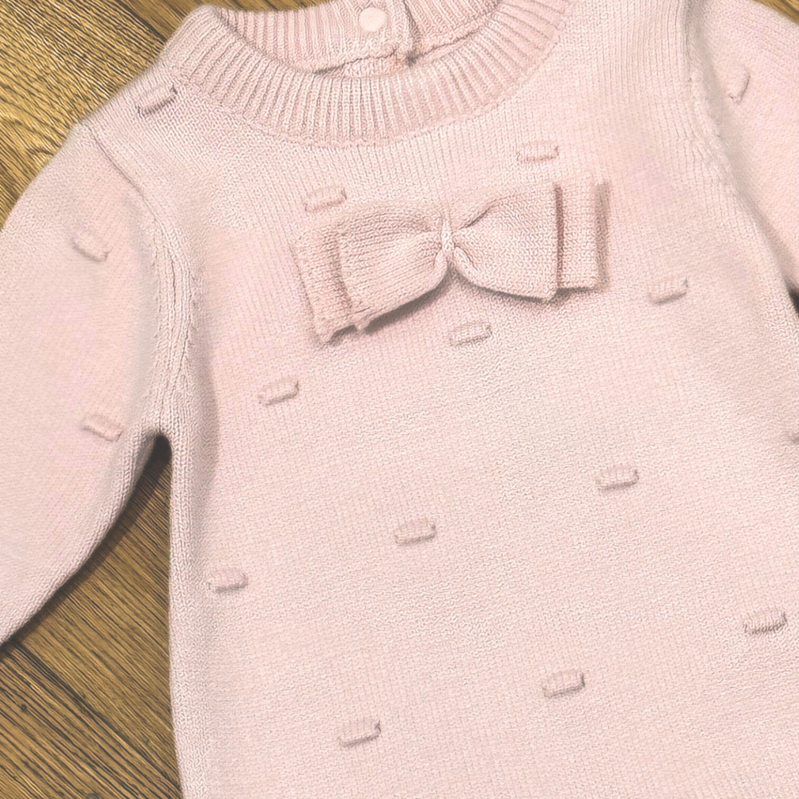 Soft and elegant, this blush pink knitted babygrow features delicate textured details and an adorable bow on the chest. Designed with snap buttons along the legs and back for easy dressing and changing.