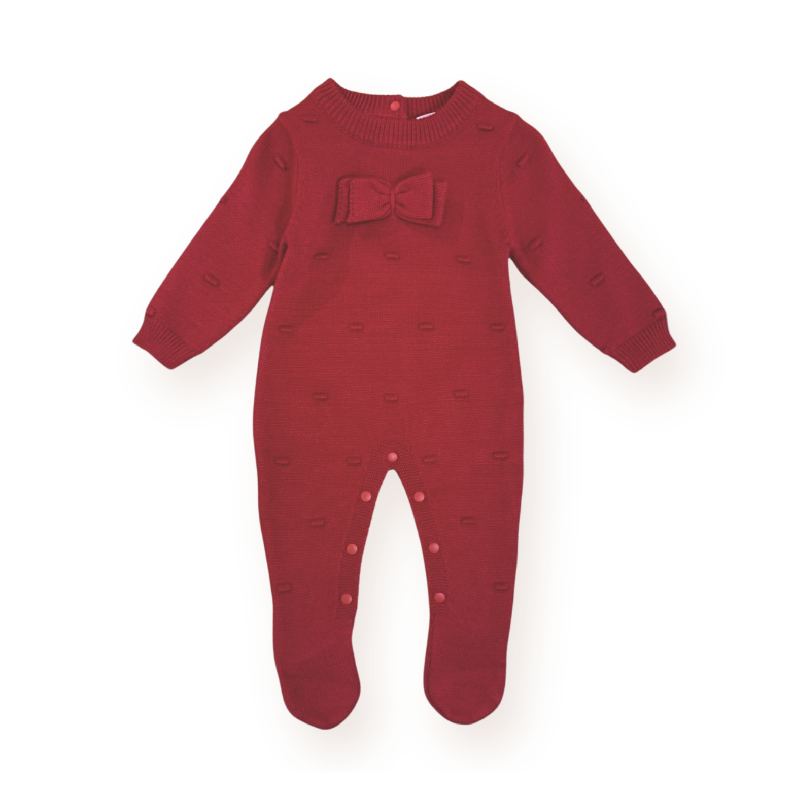 Soft and elegant, this blush pink knitted babygrow features delicate textured details and an adorable bow on the chest. Designed with snap buttons along the legs and back for easy dressing and changing.