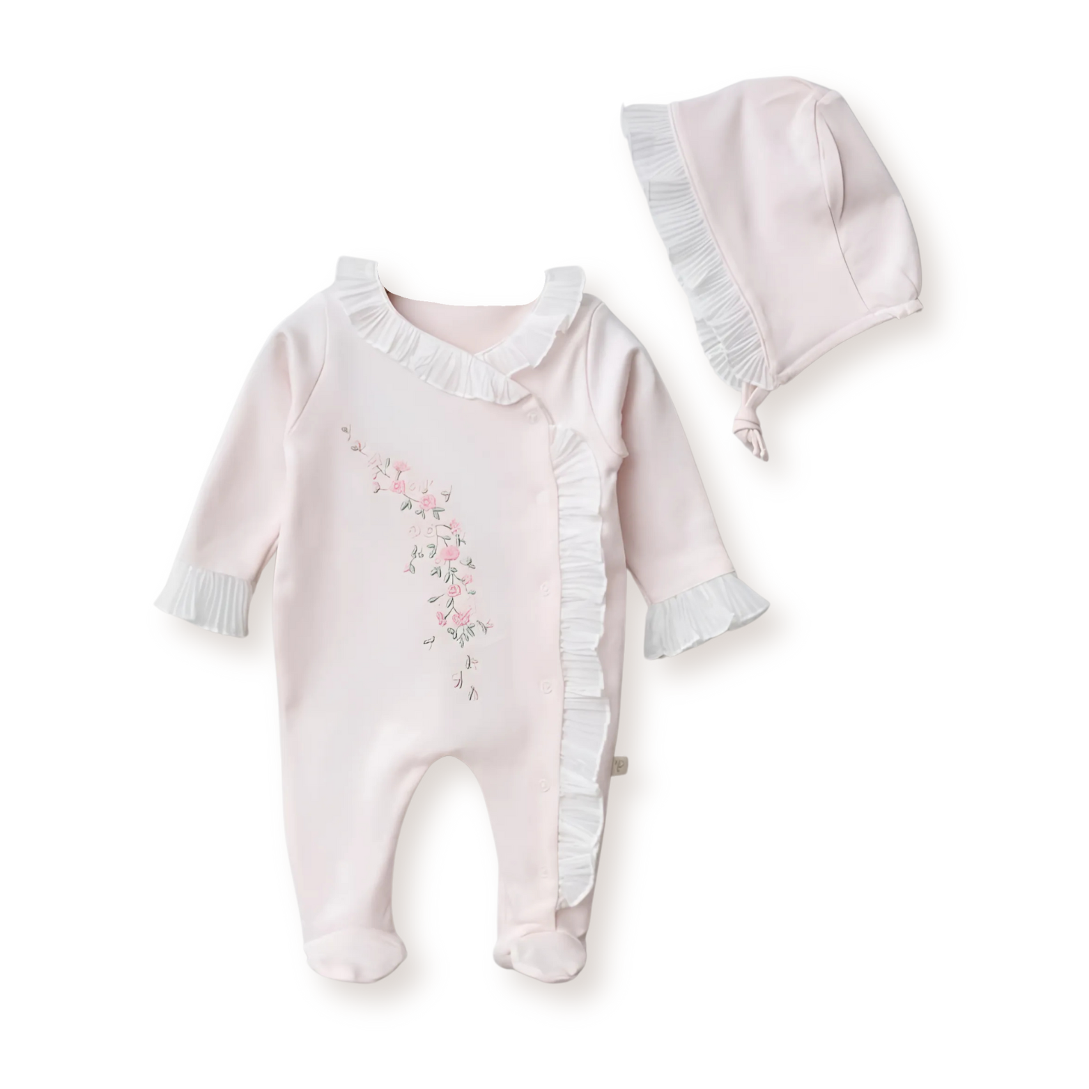 A soft blush romper with dainty florals and dreamy ruffles, complete with a bonnet for a storybook finish.