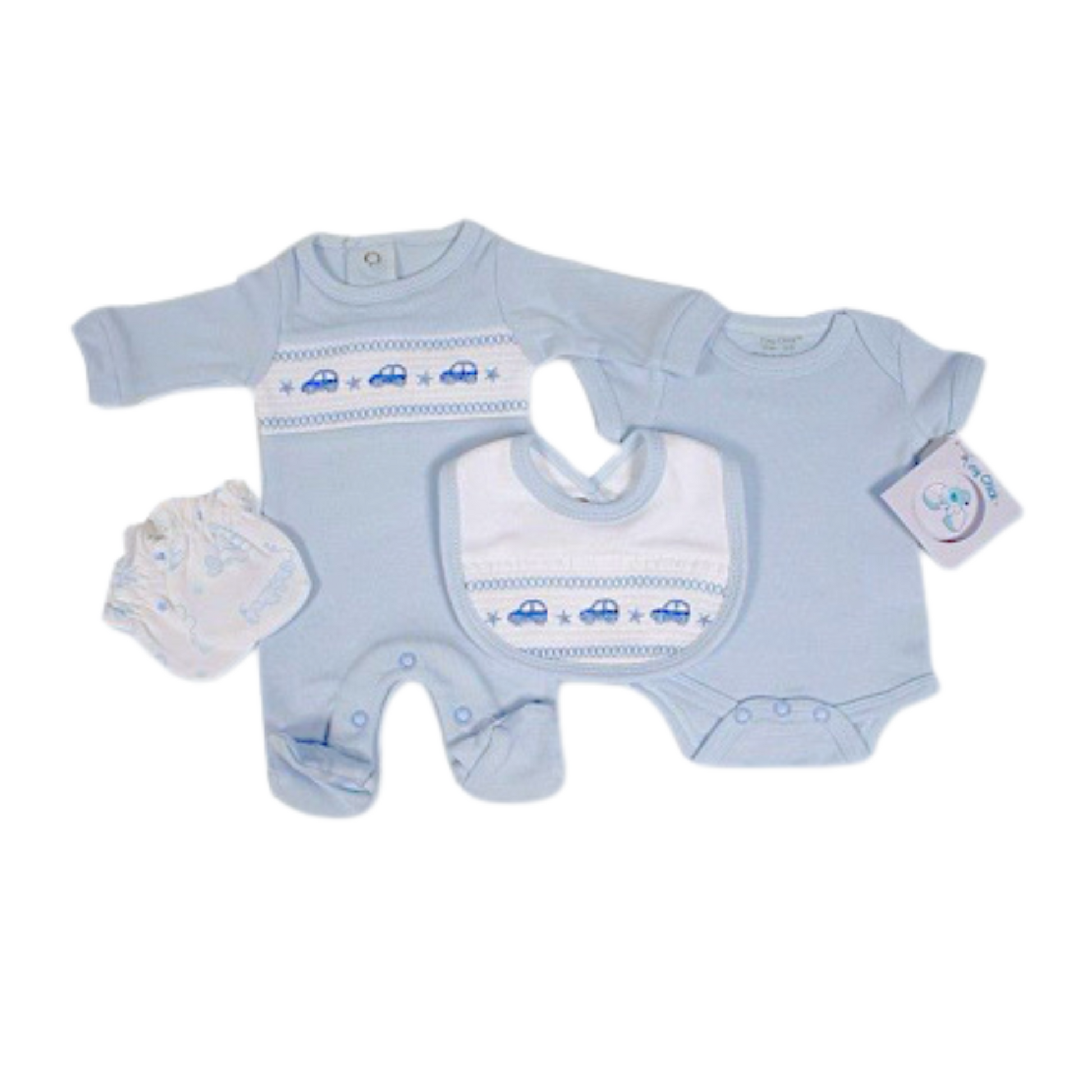 This tiny baby set includes a sleepsuit, bib, mittens and a bodysuit.