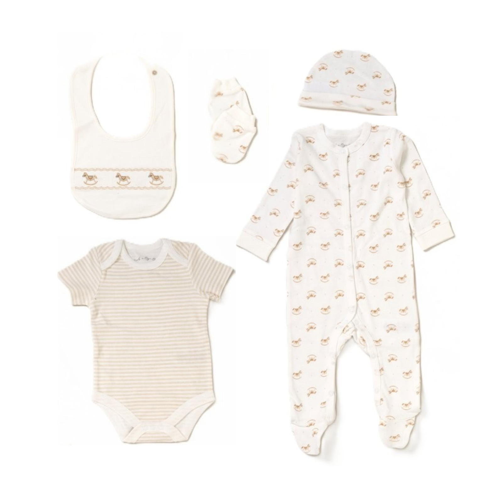 This unisex set includes a sleepsuit, hat and mittens with printed bears, a bodysuit and matching bib.