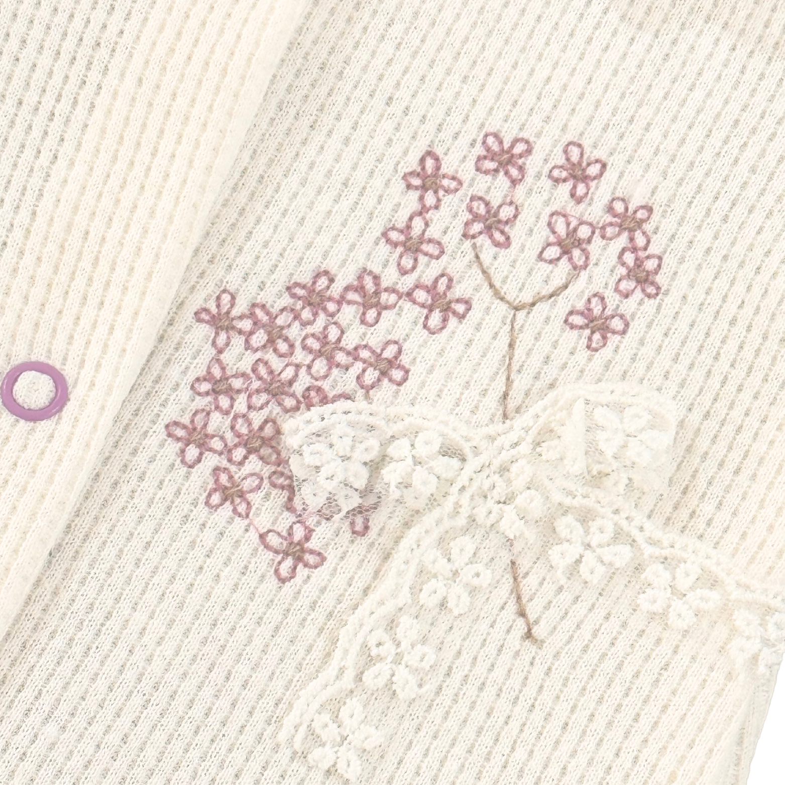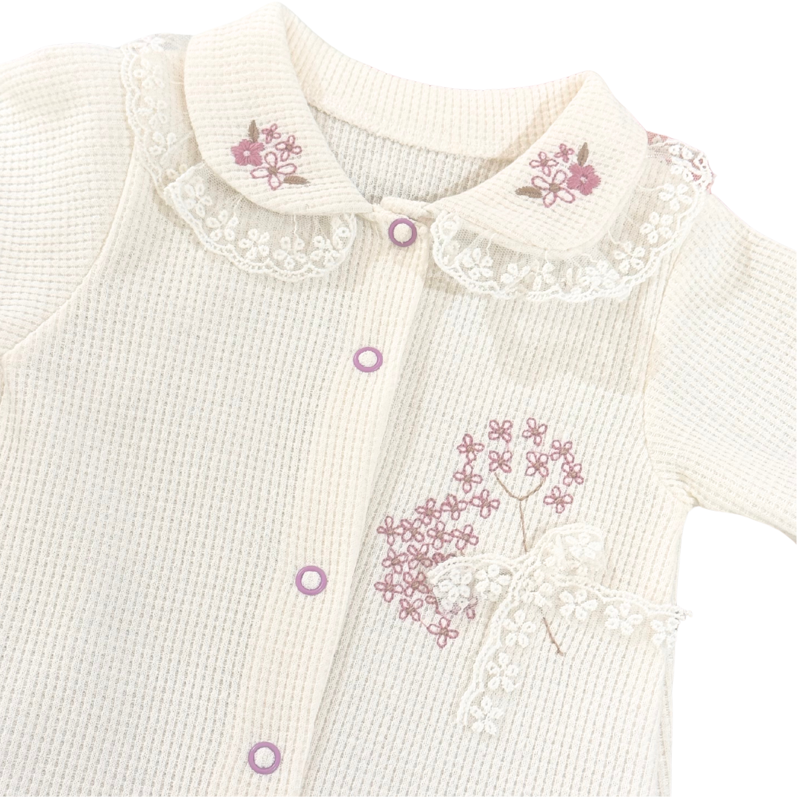 A delicate waffle sleepsuit with gentle lace trims and floral embroidery. Sweet, cosy, and timeless.
