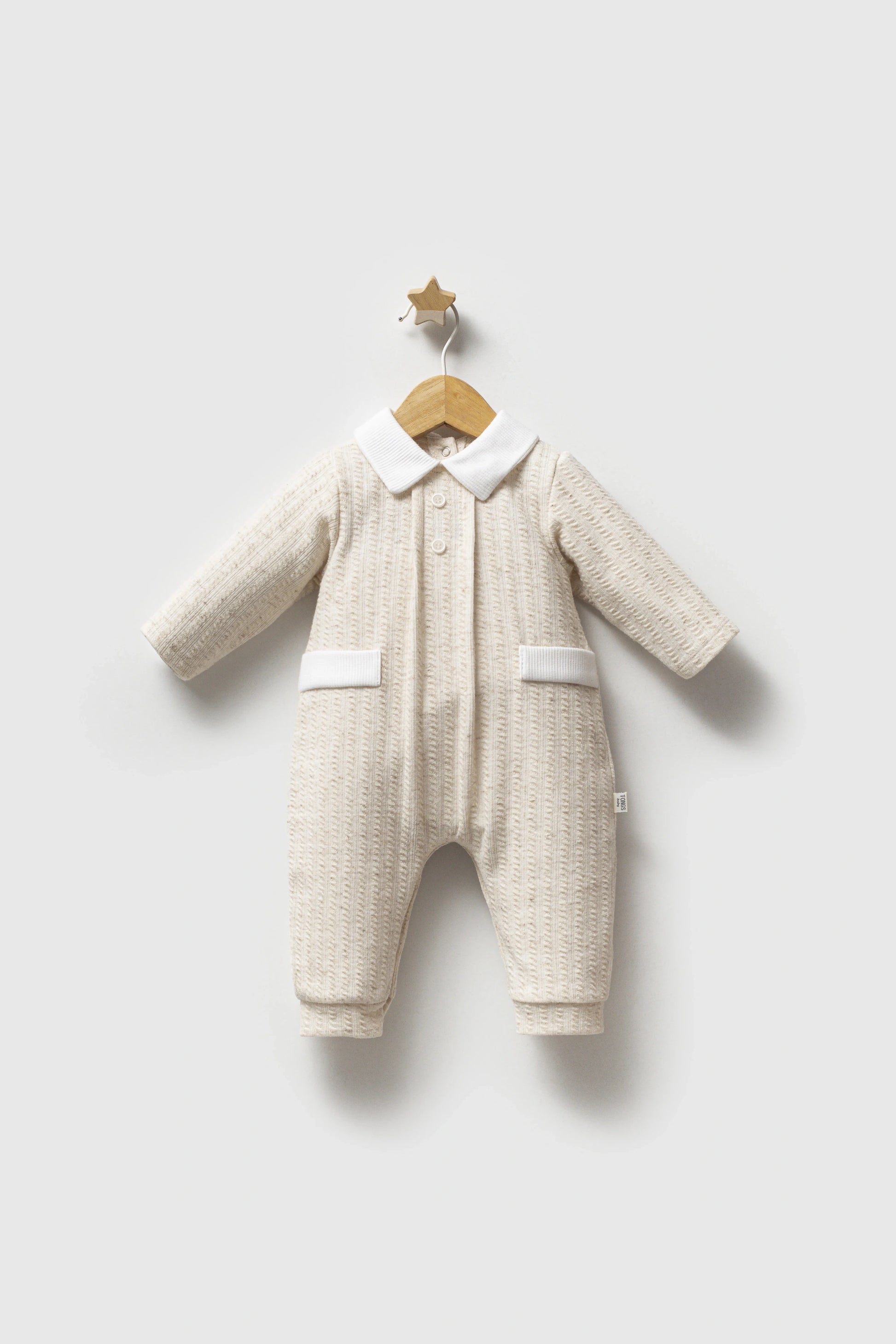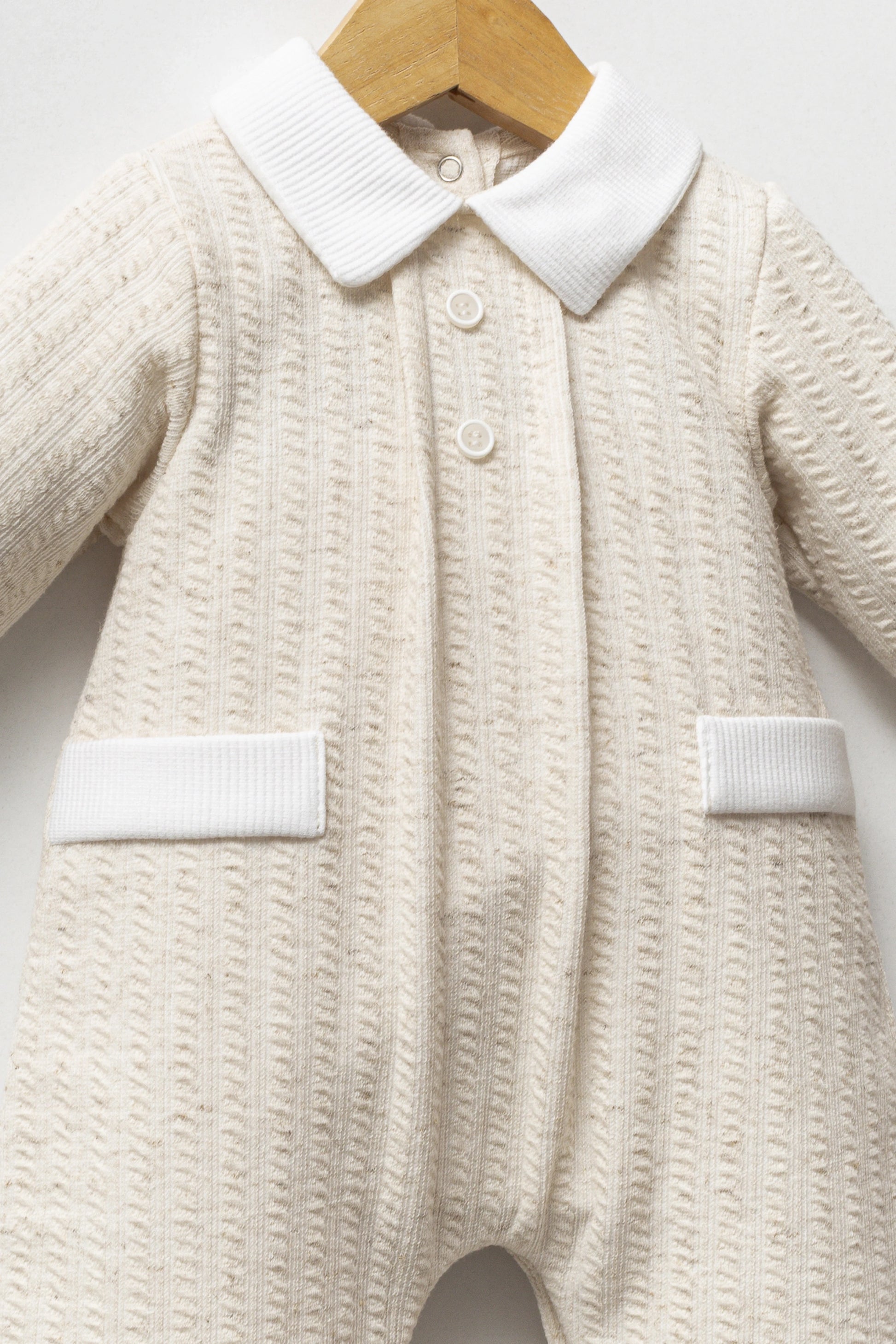 Collared romper with fastening to the back and legs. Button, pleats and pocket details.