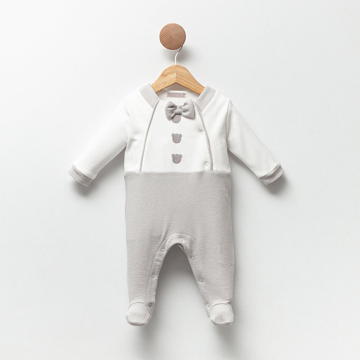 A classic, comfy footed all in one featuring a stripped collar button up detail. Perfect for everyday wear or special moments.