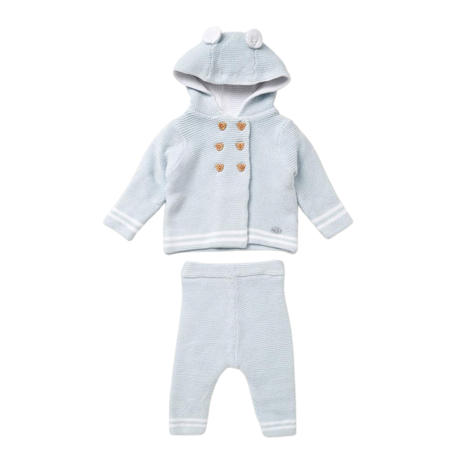 Double knit cardigan with teddy bear shaped double button fastening. The teddy bear little ears to add that extra cuteness and Matching knitted trousers.